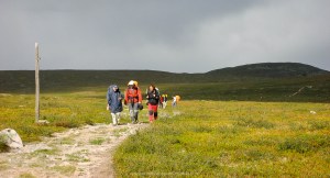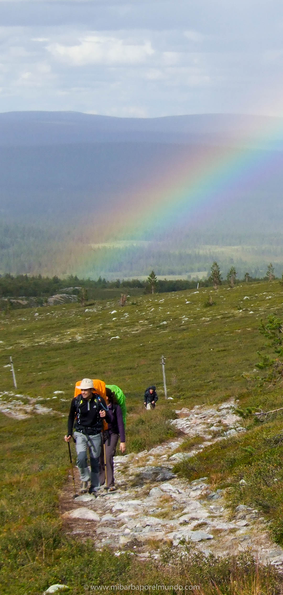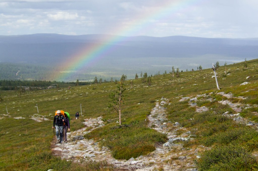 La ruta es una pasada, impresionante. Son unos 50km en total. No es un trekking muy exigente más que por el peso de las mochilas (entre 15-20kg). Hicimos etapas de 4h-7h con paradas y la primera empieza cruzando en barca el lago para poder coger el camino que lleva ruta sur. El entorno ártico es muy especial. No hay nieve en verano en esta región, pero la naturaleza está adaptada al frío. Atravesamos bosques de abetos, tundra con abedules enanos y tundra de montaña. El suelo tiene una vegetación muy frágil que es mejor no pisar. Durante mucho recorrido el parque proporciona un camino de madera para no estropear el suelo natural.