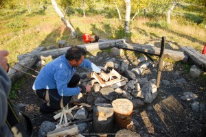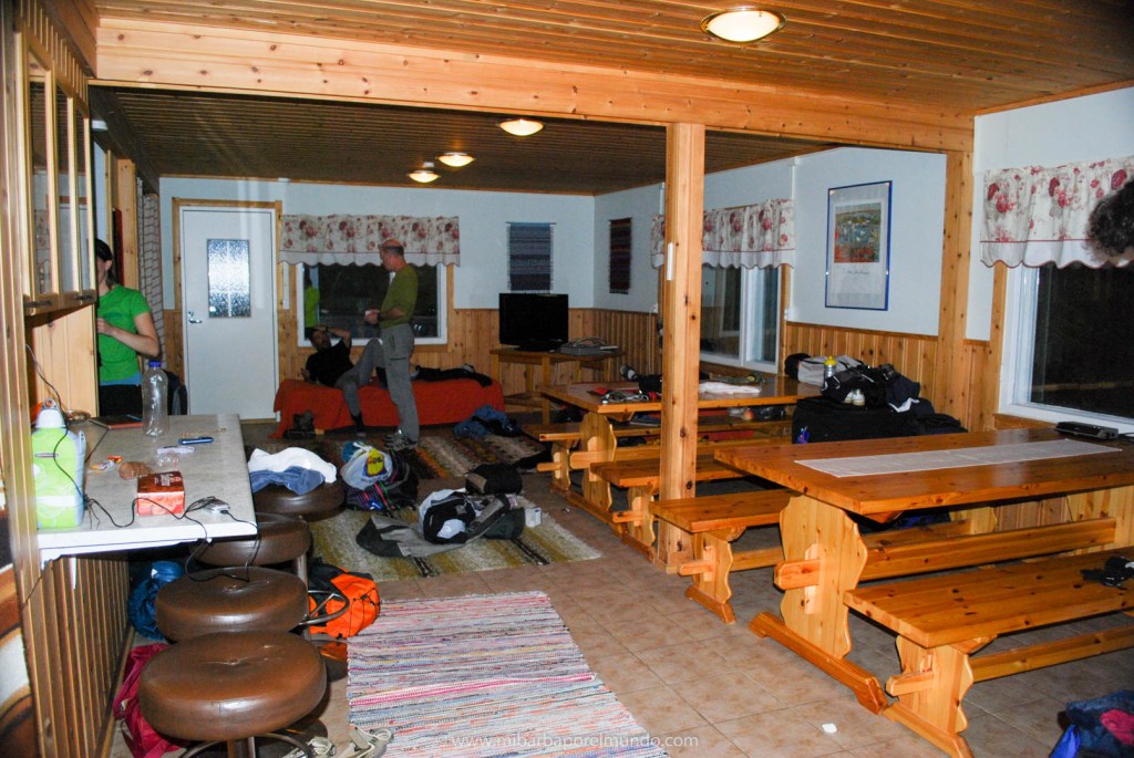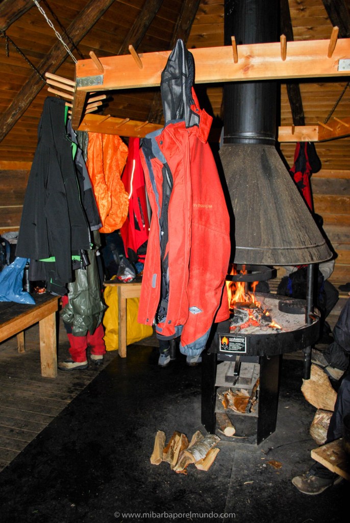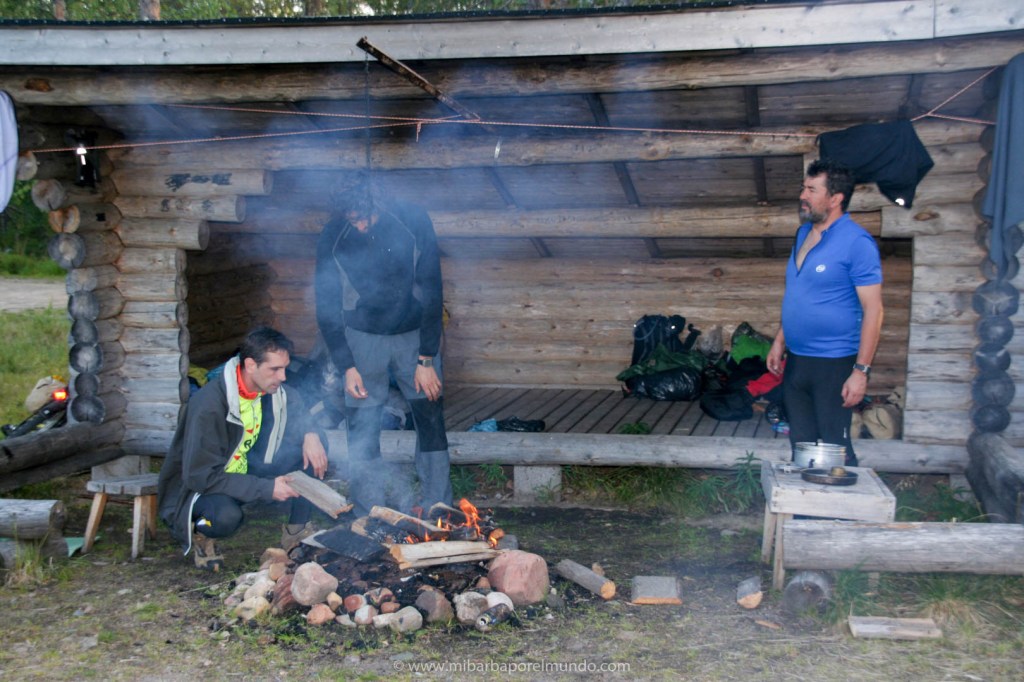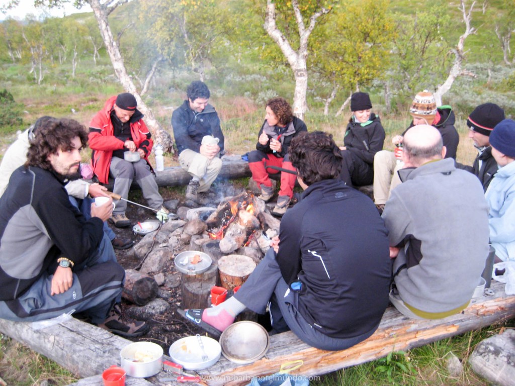 Durante estos días nos alojamos en las cabañas del parque que, como diría mi mujer, son monísimas. Son de madera y con estufas de leña porque, aunque sea agosto, es agosto en laponia y hace frío (soportable estando bien abrigado). Las noches eran geniales: cháchara y paz mientras cenamos alrededor del fuego (en las zonas comunes preparadas para ello). Por cierto: Jaime, además de ser el guía, saber organizar muy bien la logística de la comida y ser un admirador incansable de Chiquito de la Calzada, ¡es un gran cocinero de campaña!.