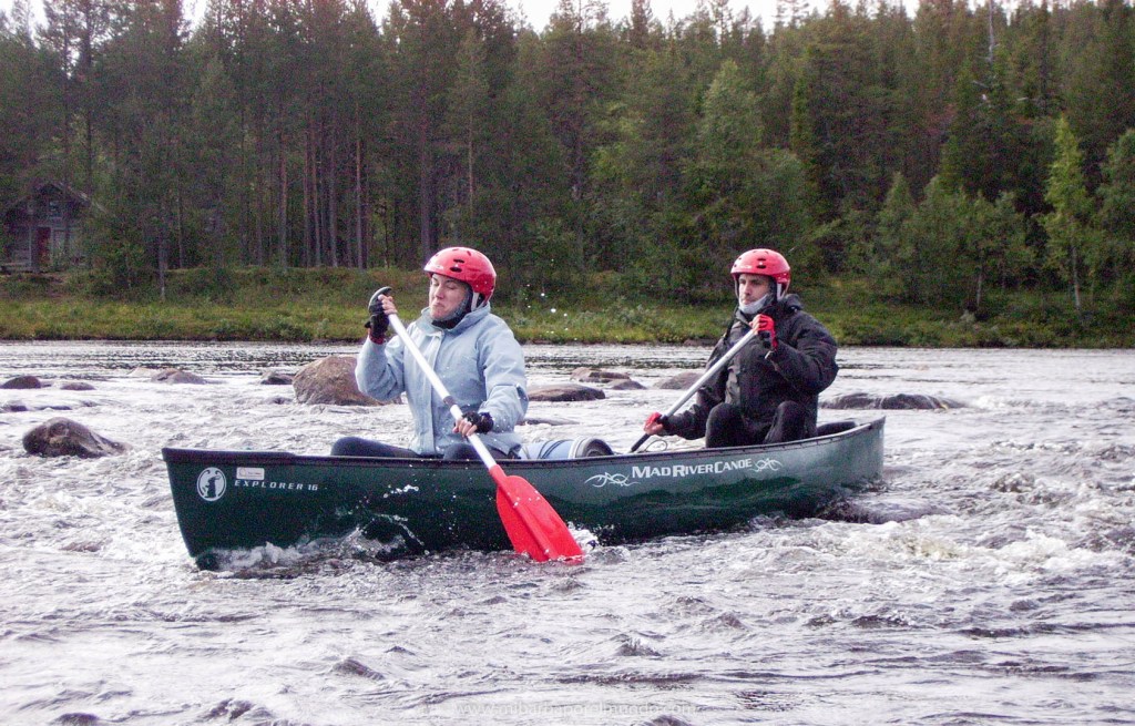 Una vez acabado el trekking no hubo descanso. En las mismas cabañas donde nos alojamos al final del trekk en Yli-Kyro realizamos el cambio de equipo y preparamos el material para las canoas canadienses: escarpines, neoprenos, mallas, ropa de abrigo, sacos de dormir… lo imprescindible para que quepa todo en los bidones estancos que llevamos dentro de la canoa (más la comida y los utensilios para cocinar, claro). El plan es descender unos 120km del río Ounas durante 4 días, desde Yli-Kyro hasta Kaukonen, pasando por Tepasto y Kittila. No es un río muy técnico, aunque hay algunos rápidos de grado II y III. Fueron entre 20 y 40km diarios dependiendo del río durante 5-7h.